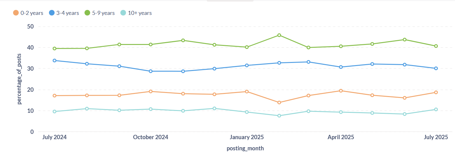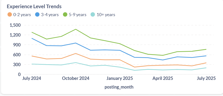 - Percentages: Although the total number of jobs went down, the composition of the job market did not change. Organizations were looking for the same mix of experience levels throughout the year.
