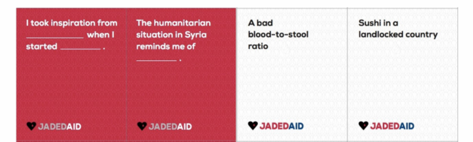 We also need some way to sort out all the bad blood we accumulate in this business day over day. To help on that, three geniuses invented in 2015 a version of cards against humanity specifically targeting the cynical soul of the field. It was called JadedAid.