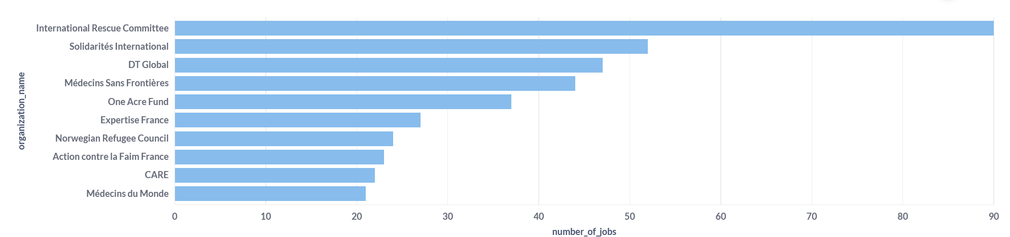 This horizontal bar chart ranks the top 10 humanitarian organizations by their current number of active job postings. It provides a clear, at-a-glance view of the most active recruiters in the sector.