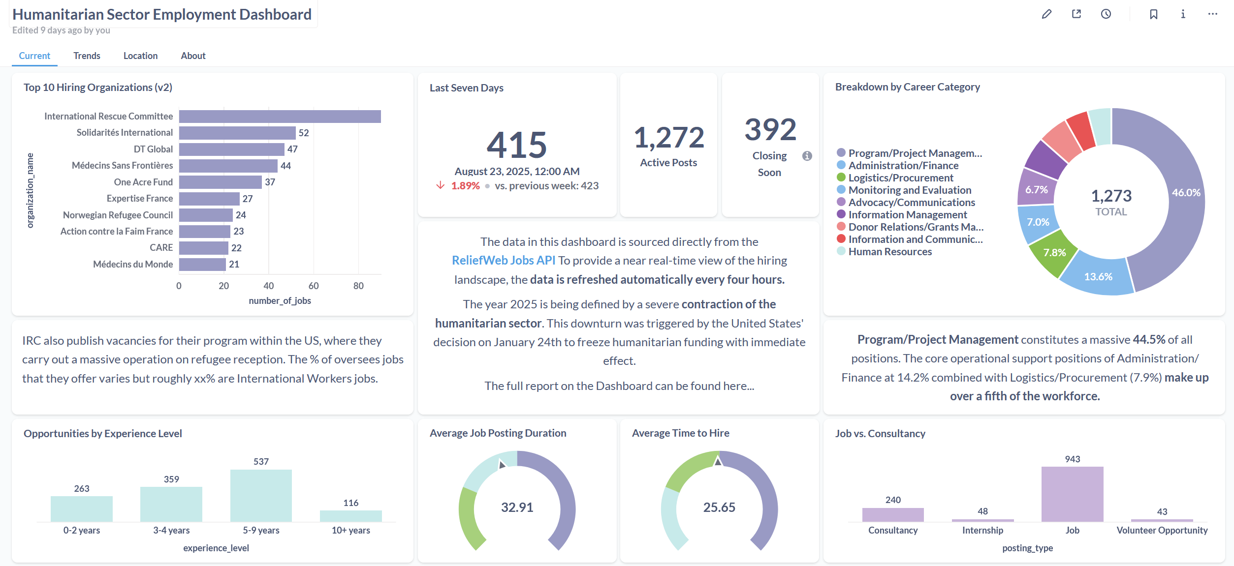 The Humanitarian Sector Employment Dashboard is a Business Intelligence Demo designed to provide a dynamic and near real-time overview of the hiring landscape within the aid community. By automatically sourcing and refreshing data every four hours from the ReliefWeb Jobs API, it visualizes key metrics such as the top hiring organizations, the distribution of roles across different career categories and the required experience levels for available positions.